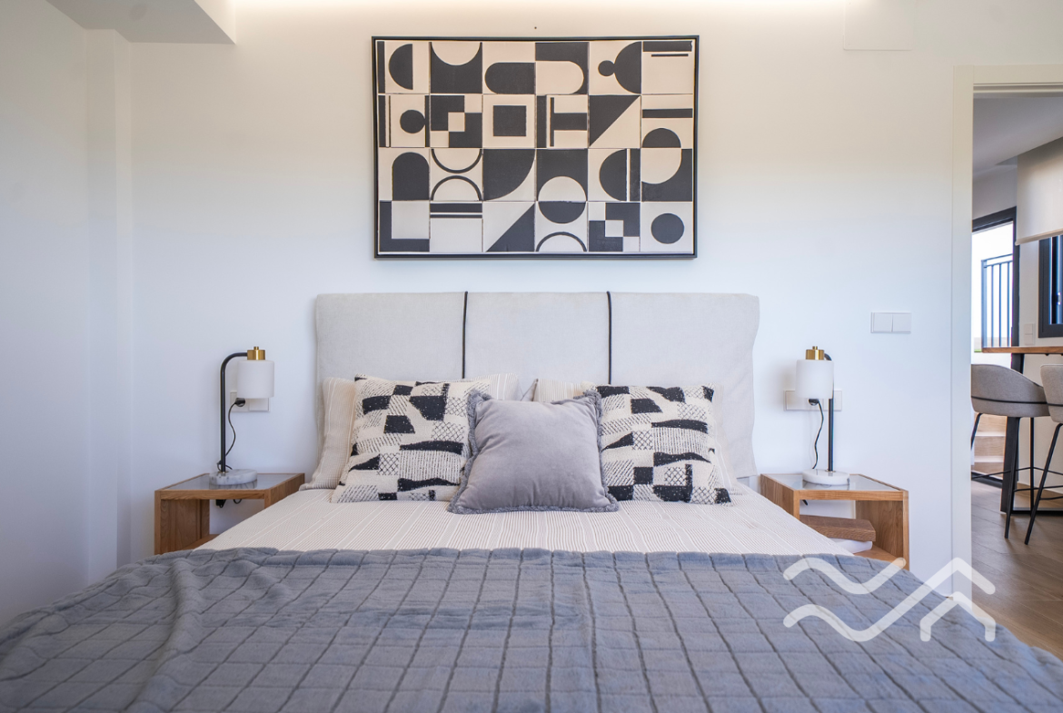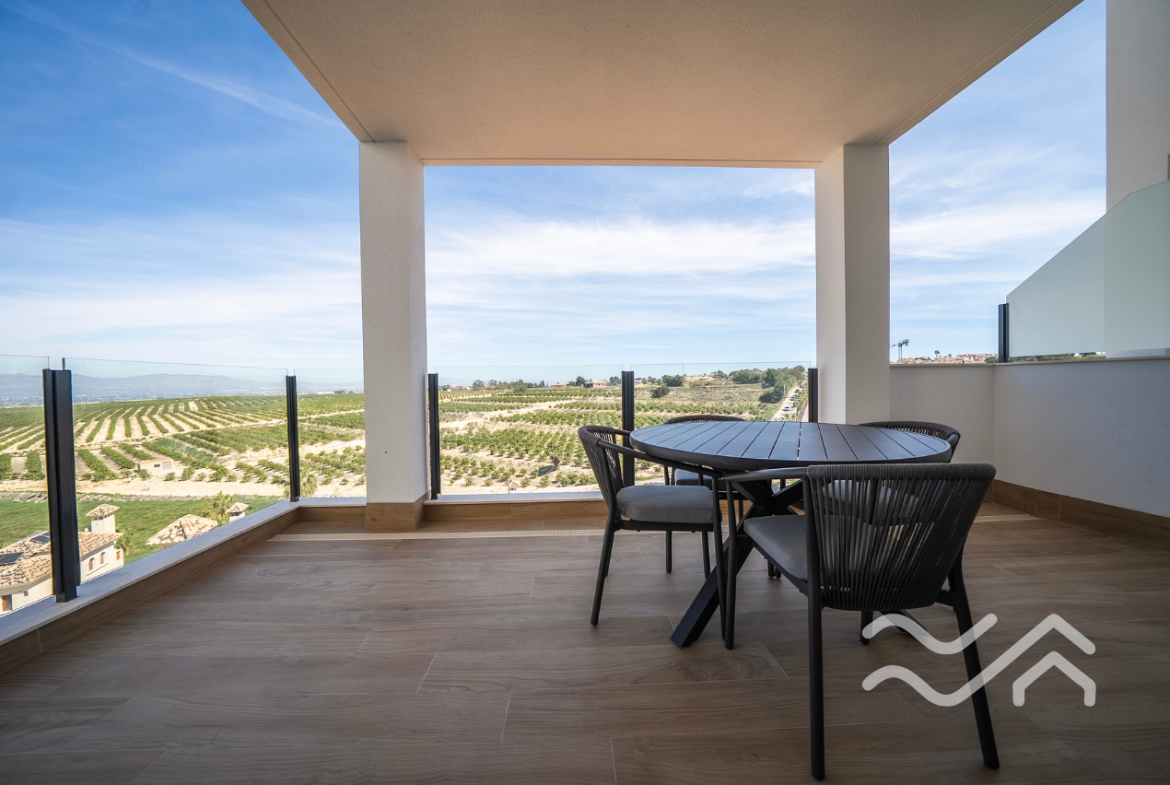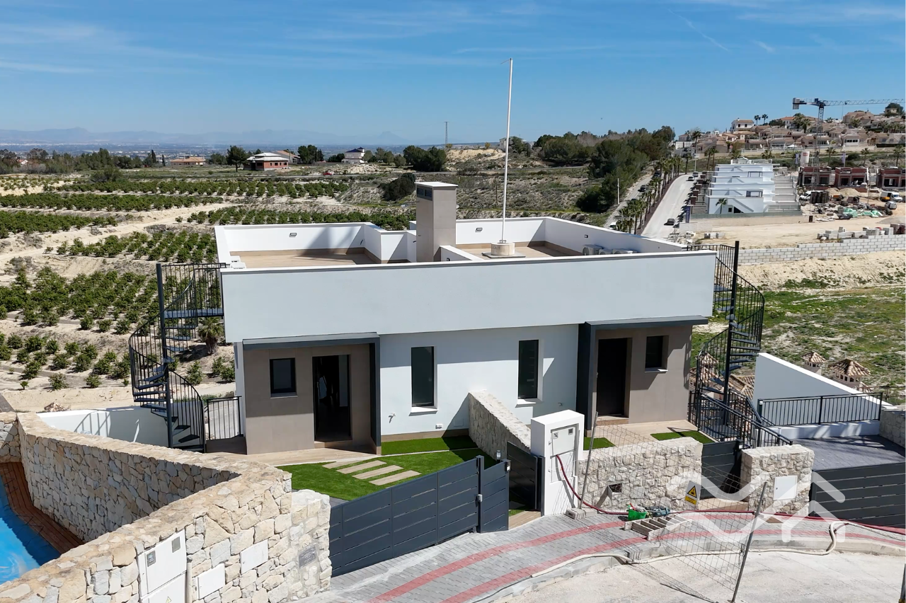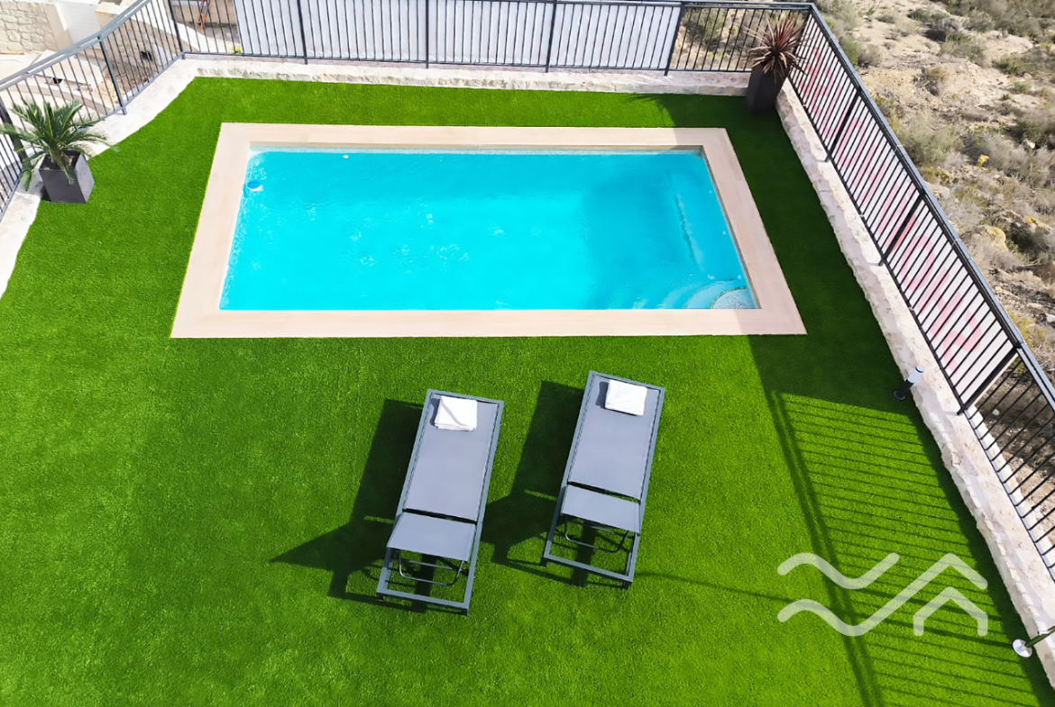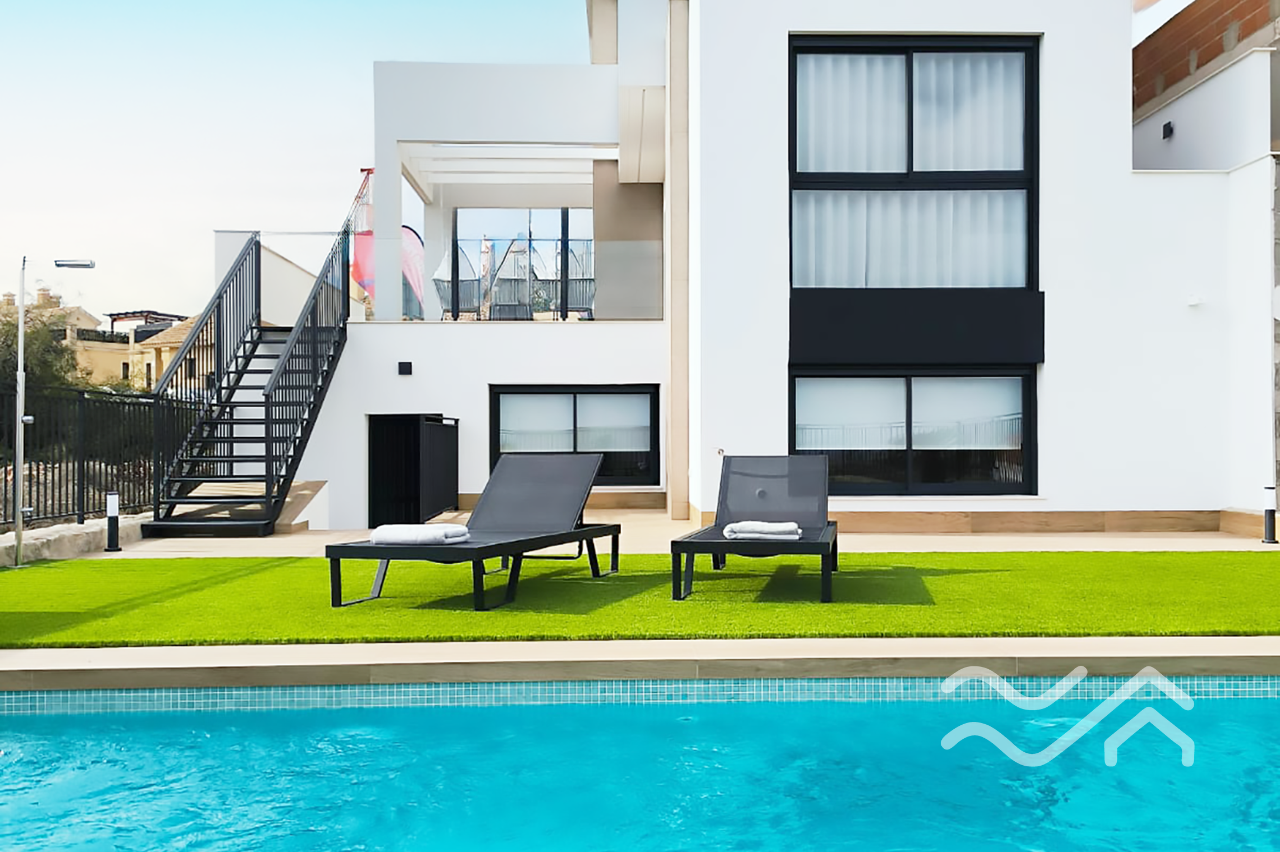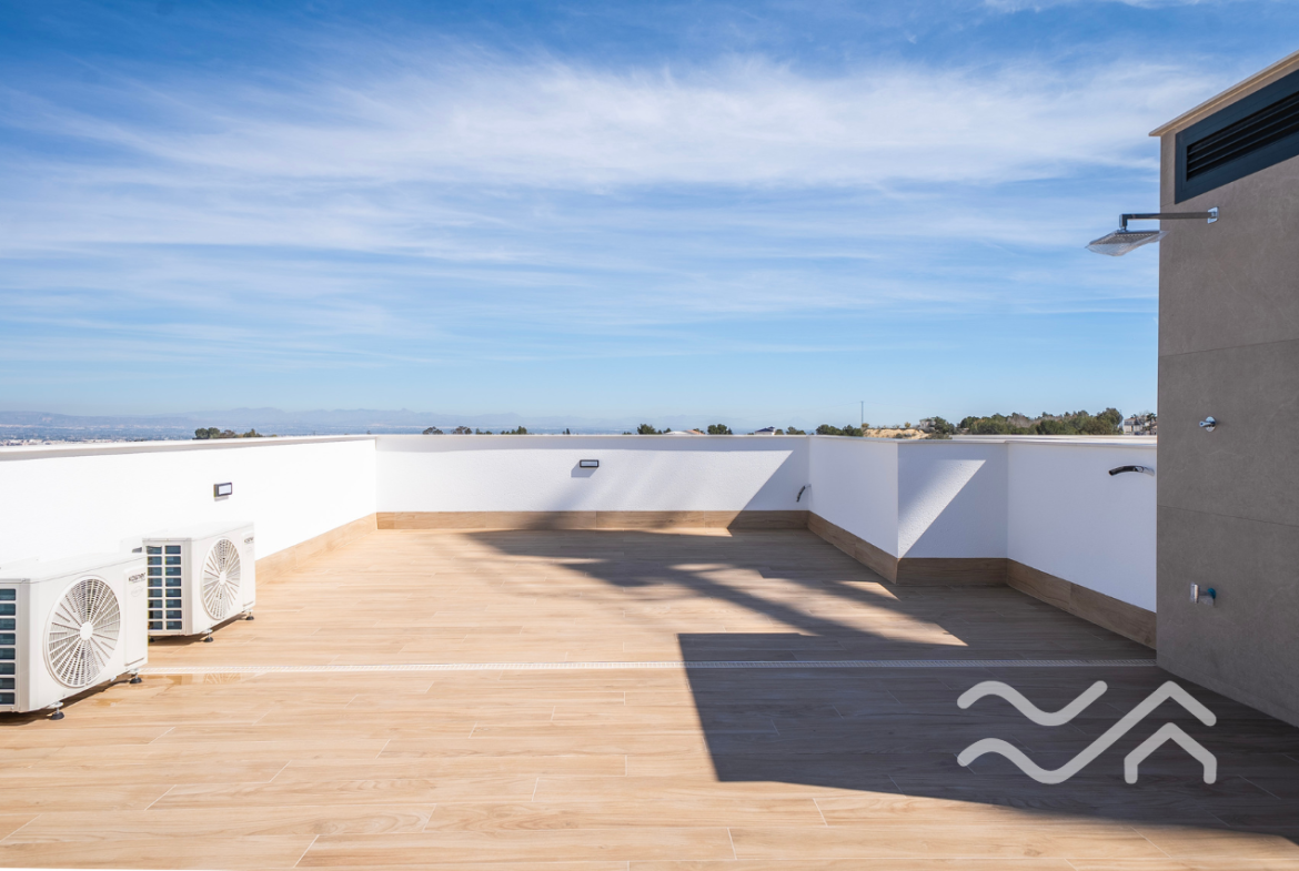 Uteområdene er like innbydende som innsiden. Hver bolig har privat hage, flere terrasser samt solarium på taket, hvor utsikten over landskapet i Vega Baja gir en helt egen ro. Privat basseng kan leveres som tilvalg, og parkering er på egen tomt. Både innvendig og utvendig belysning er inkludert, noe som gir boligen en lun og hyggelig stemning også etter solnedgang.