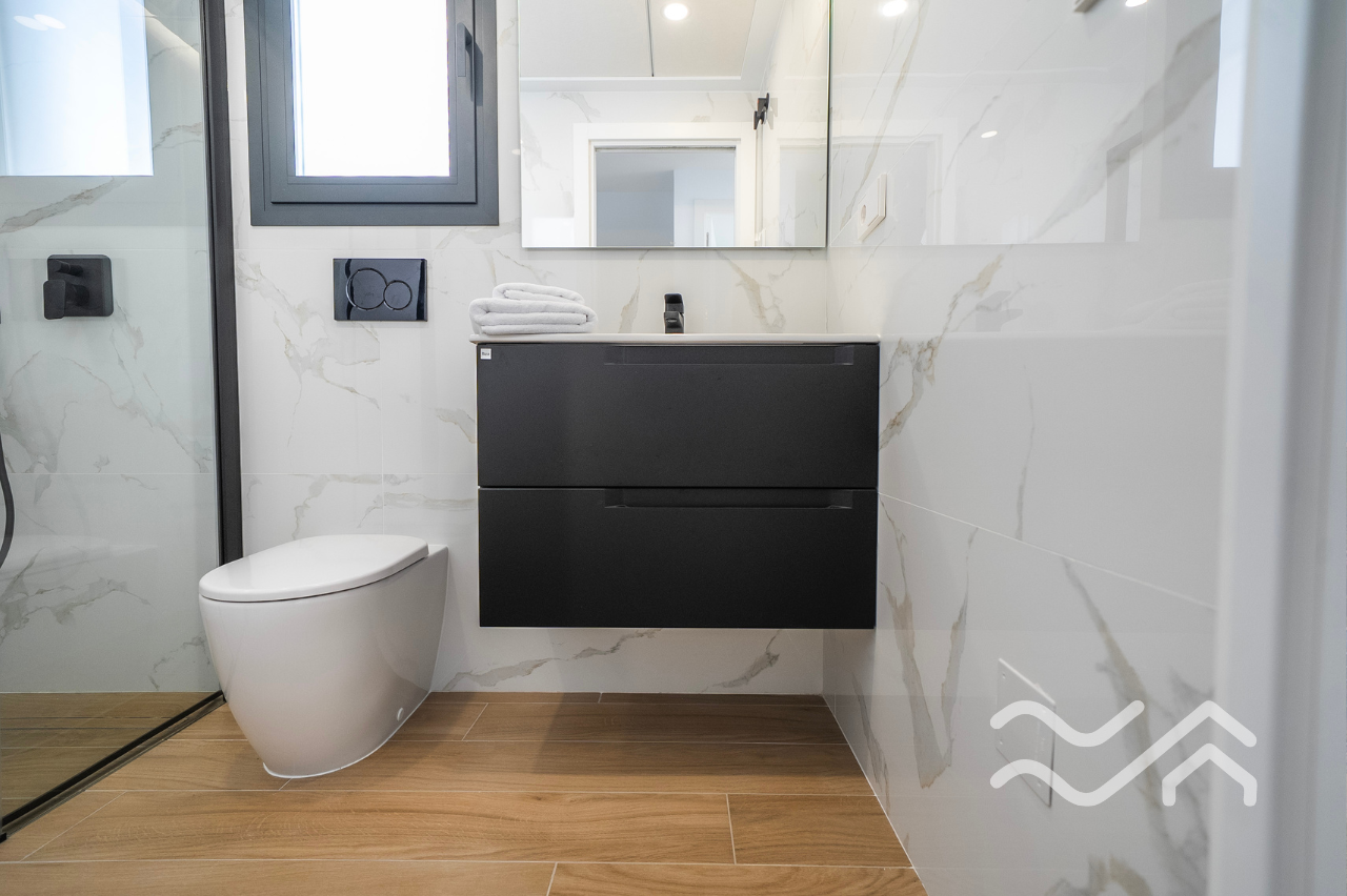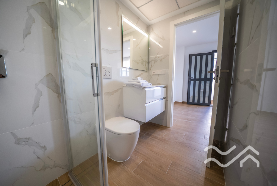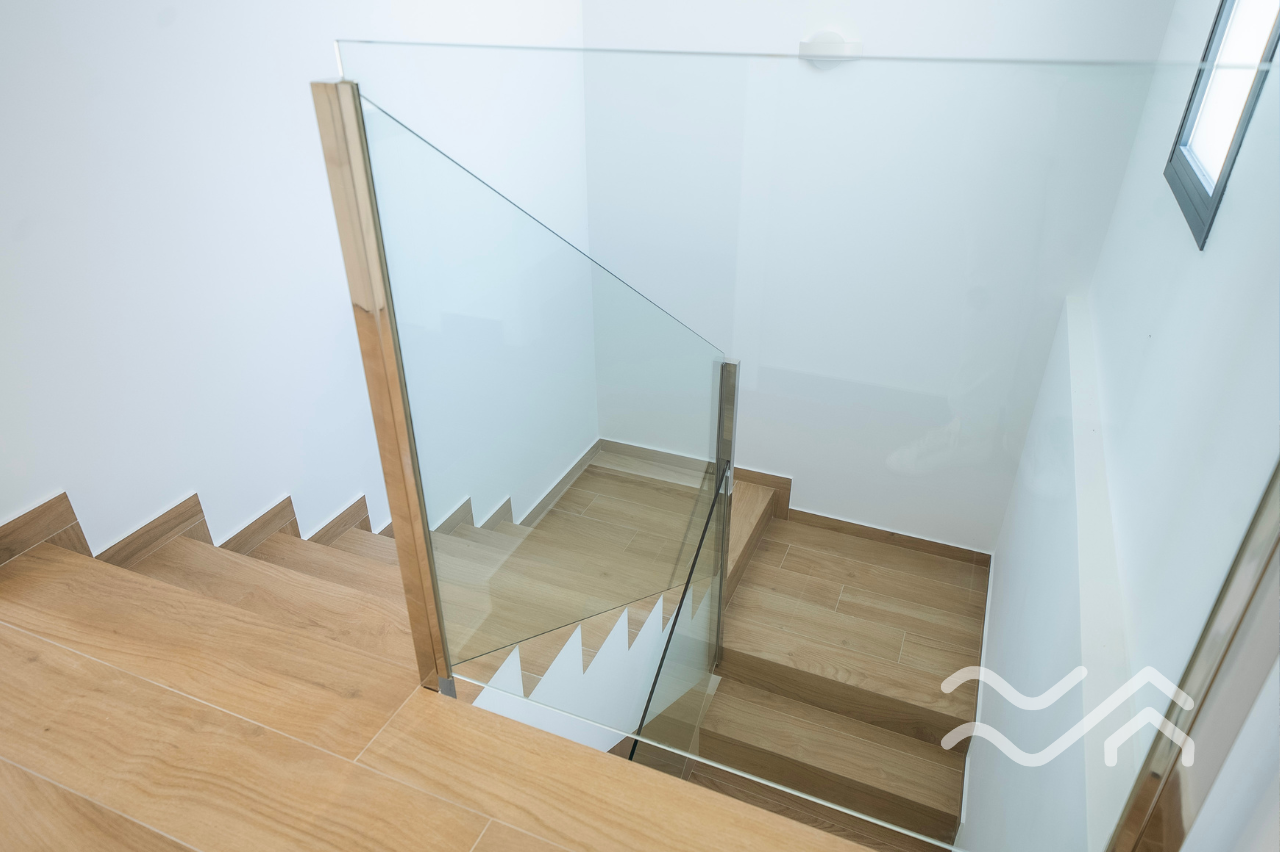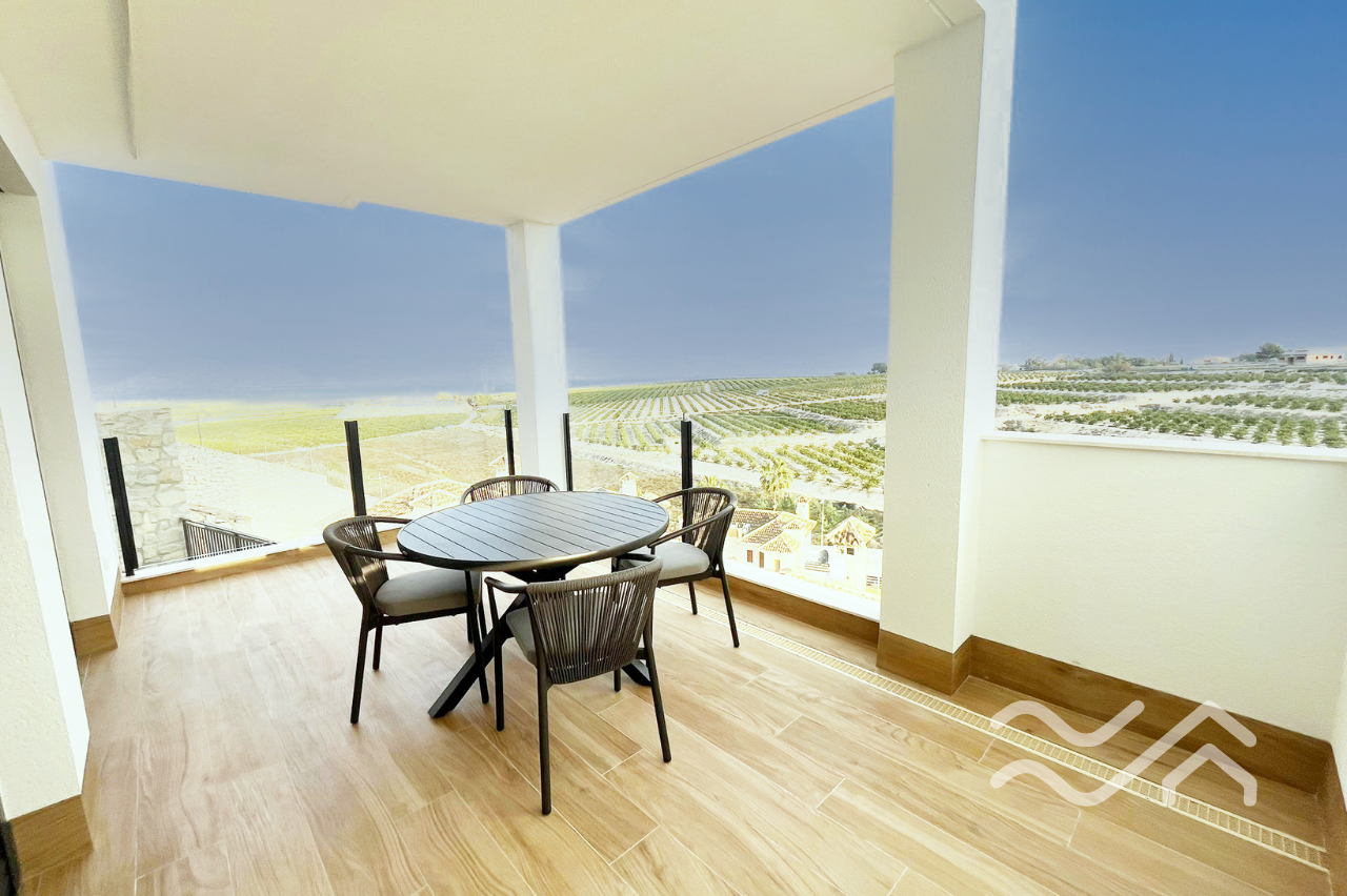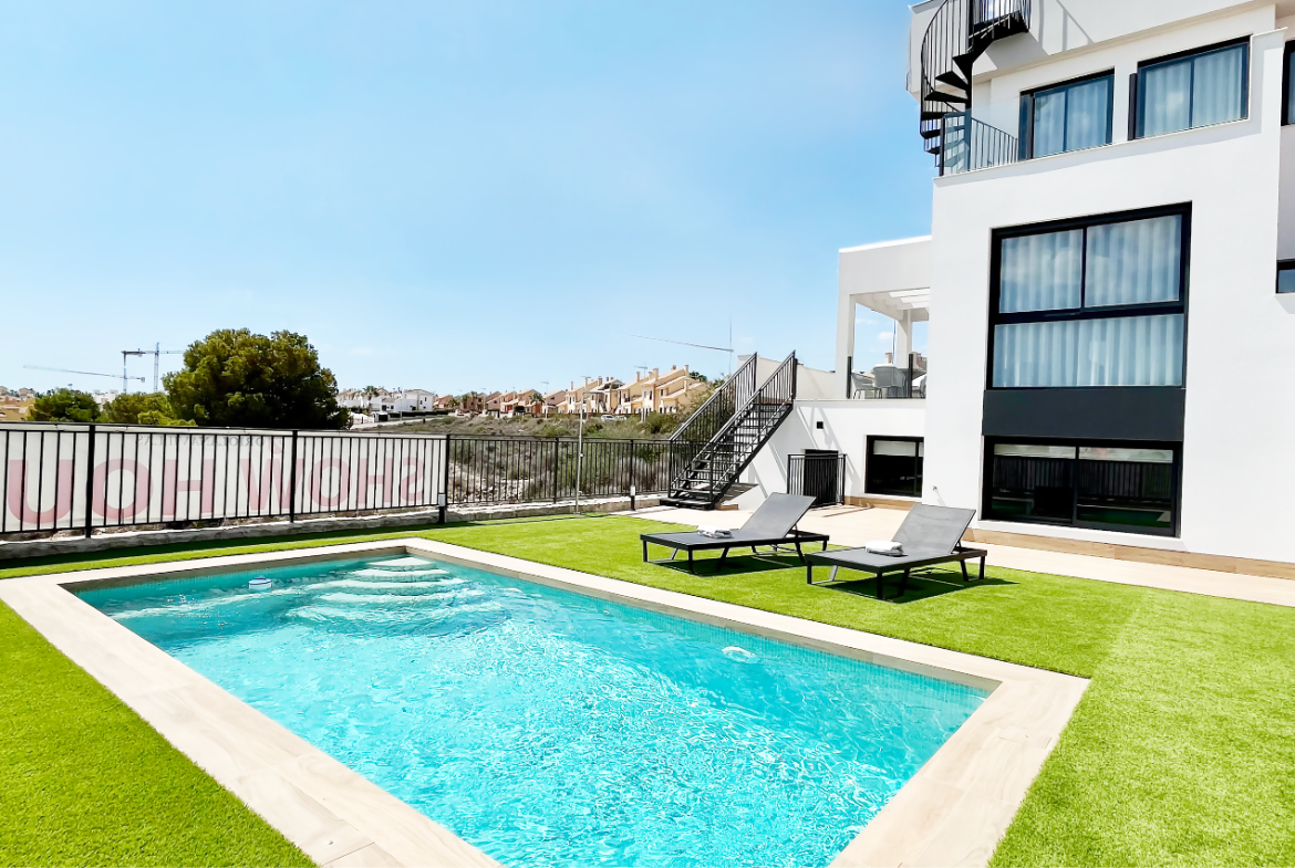 Uteområdene er like innbydende som innsiden. Hver bolig har privat hage, flere terrasser samt solarium på taket, hvor utsikten over landskapet i Vega Baja gir en helt egen ro. Privat basseng kan leveres som tilvalg, og parkering er på egen tomt. Både innvendig og utvendig belysning er inkludert, noe som gir boligen en lun og hyggelig stemning også etter solnedgang.