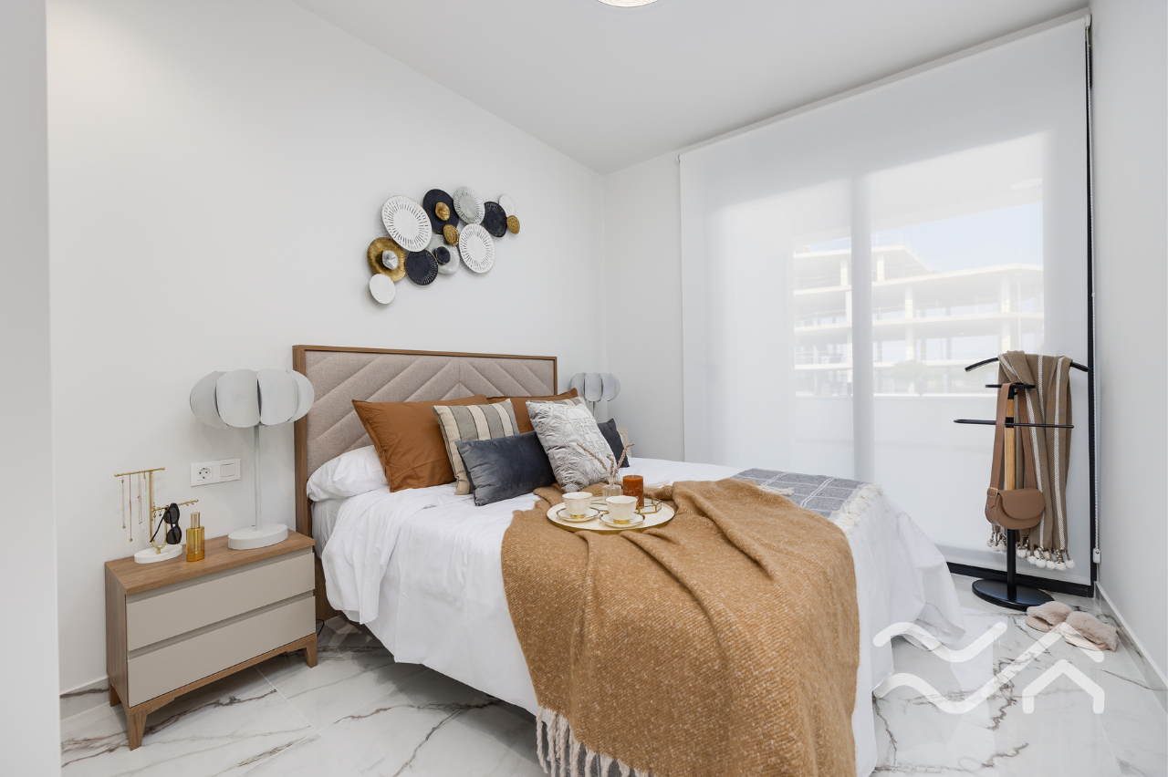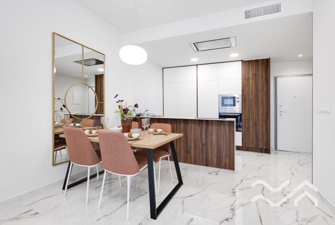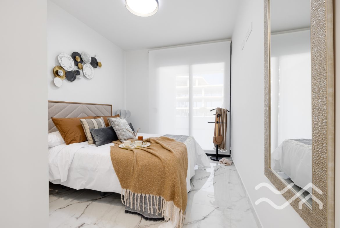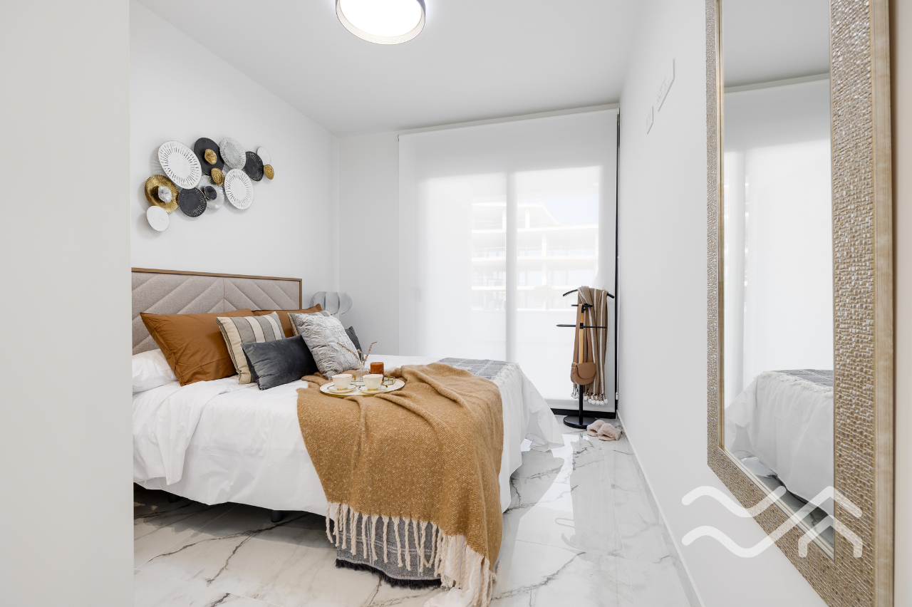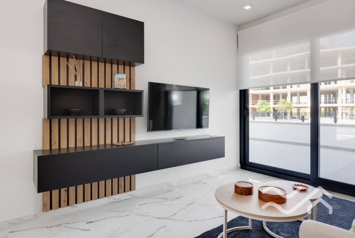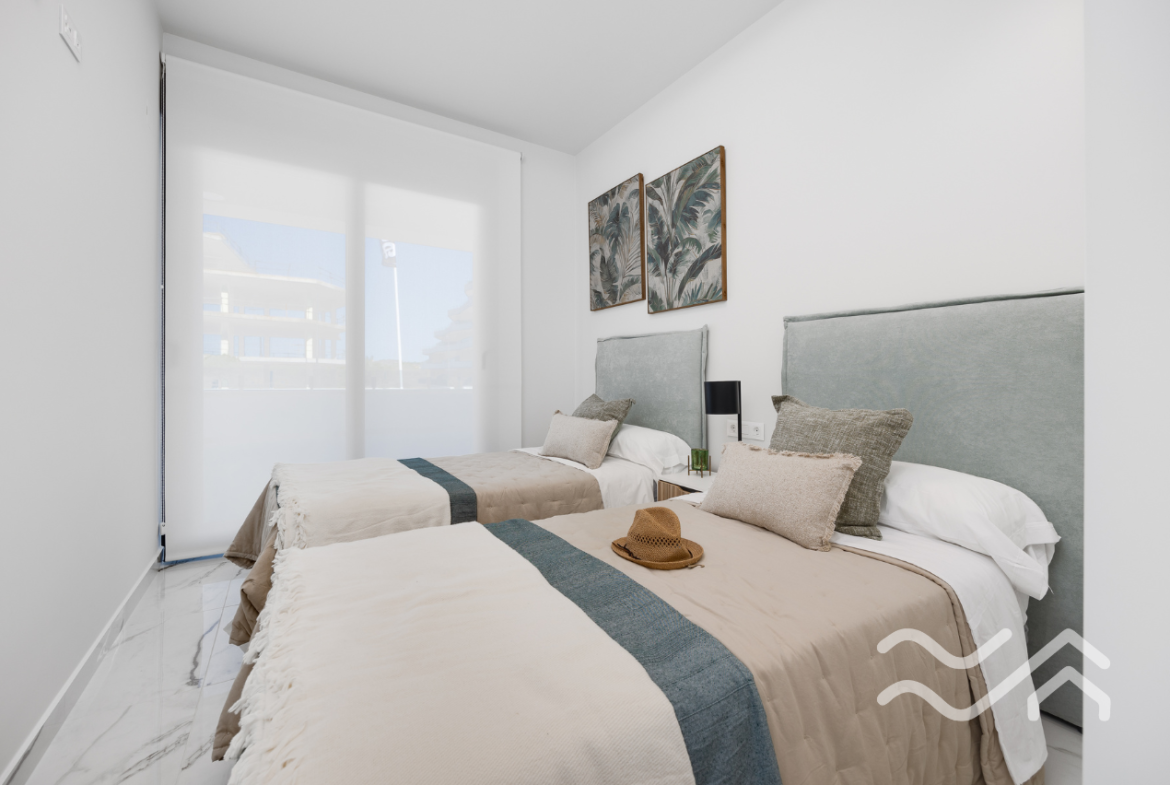 The apartments offer two bedrooms and two bathrooms, with an open-plan living and kitchen area that connects seamlessly to the terrace. The kitchen comes fully equipped with appliances, and the overall style is modern, clean and practical – perfect for relaxed living in Spain. Large windows allow plenty of natural light and create a smooth transition between indoor and outdoor spaces.