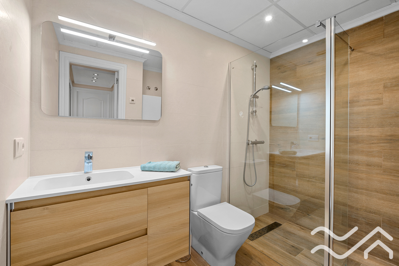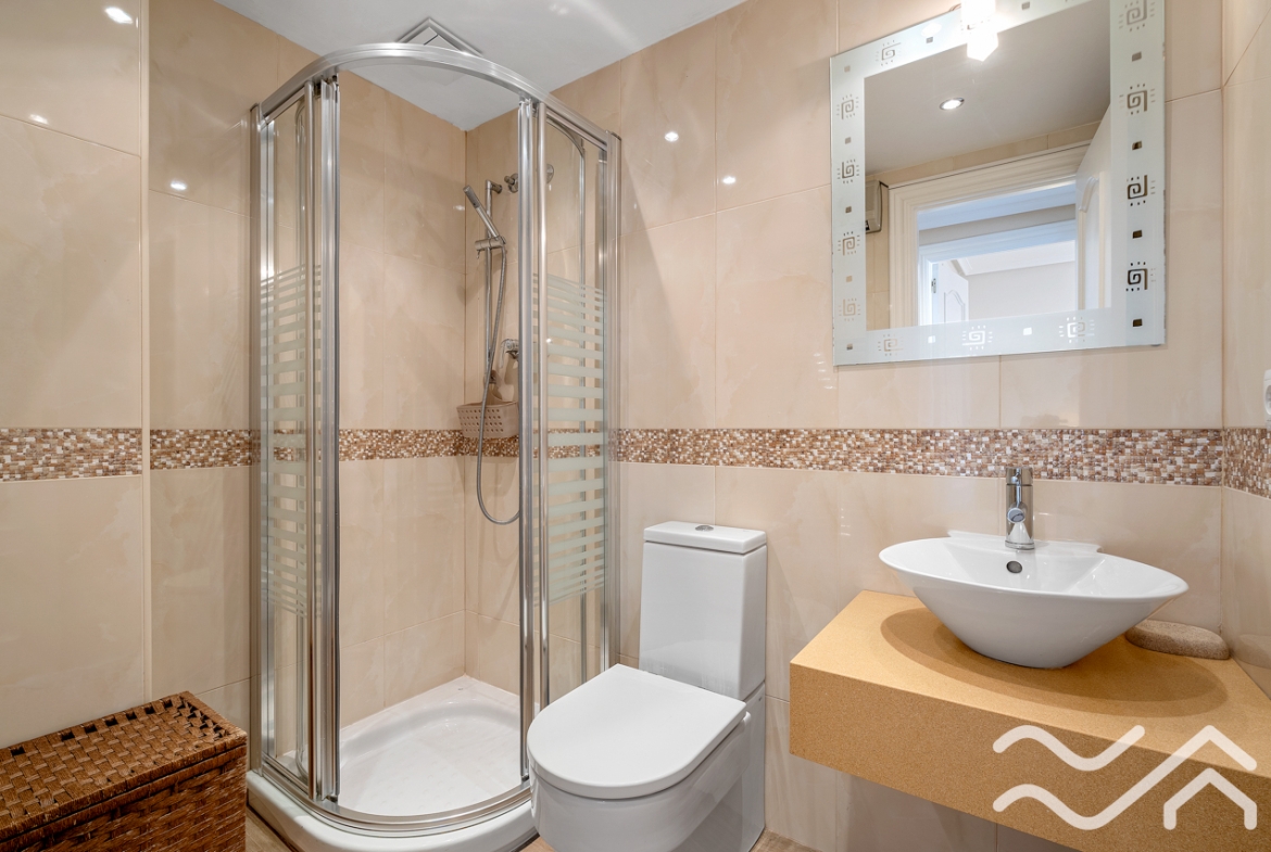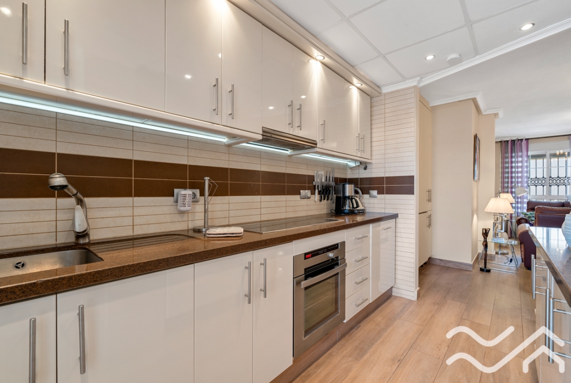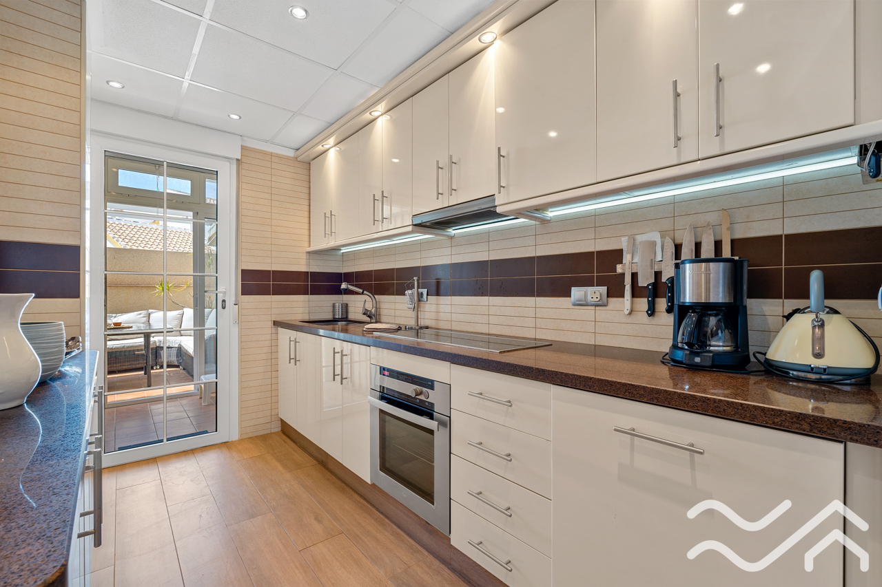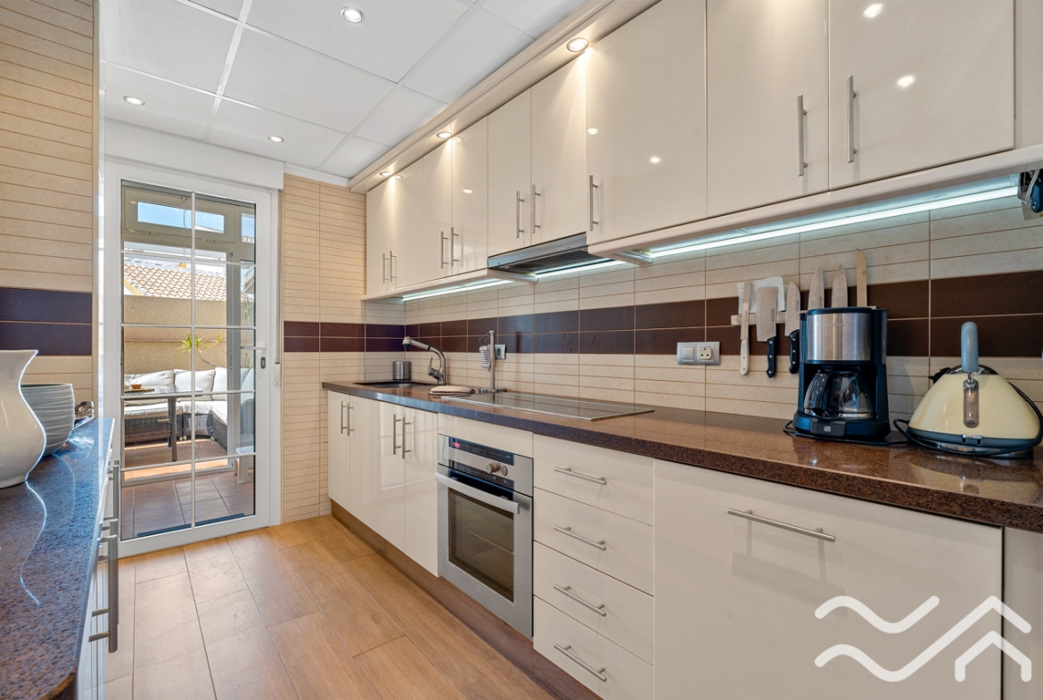 From the kitchen you step out onto a large, sunny terrace with a sliding pergola that can be adjusted as you wish – the perfect spot for long meals or relaxing afternoons in the shade. The terrace also has a small storage room, as well as private parking (no. 9).