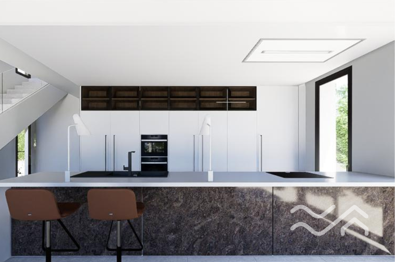 As you step inside, you’re welcomed by a bright and open living space where large windows blur the line between indoors and outdoors. Natural light pours in, creating an immediate sense of calm and space – while still feeling elegant, modern, and incredibly inviting. The kitchen and living area flow seamlessly together, forming a natural gathering point for both everyday life and long, memorable dinners with family and friends.