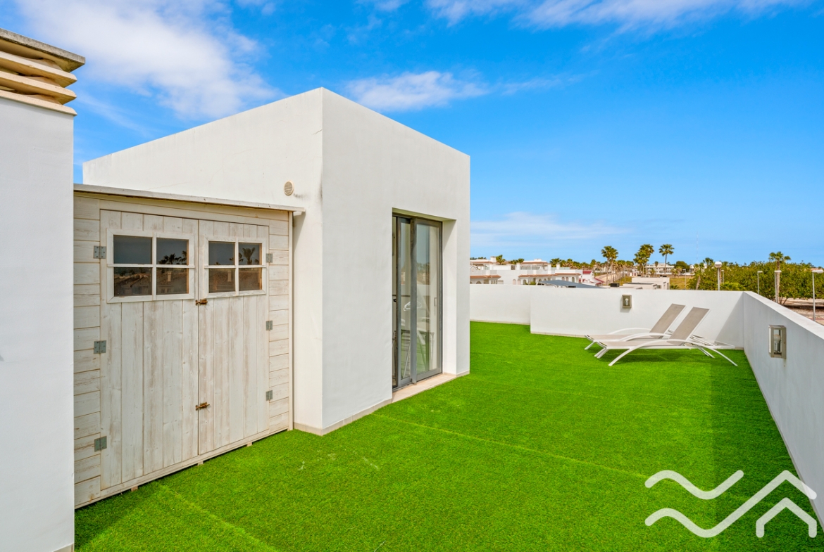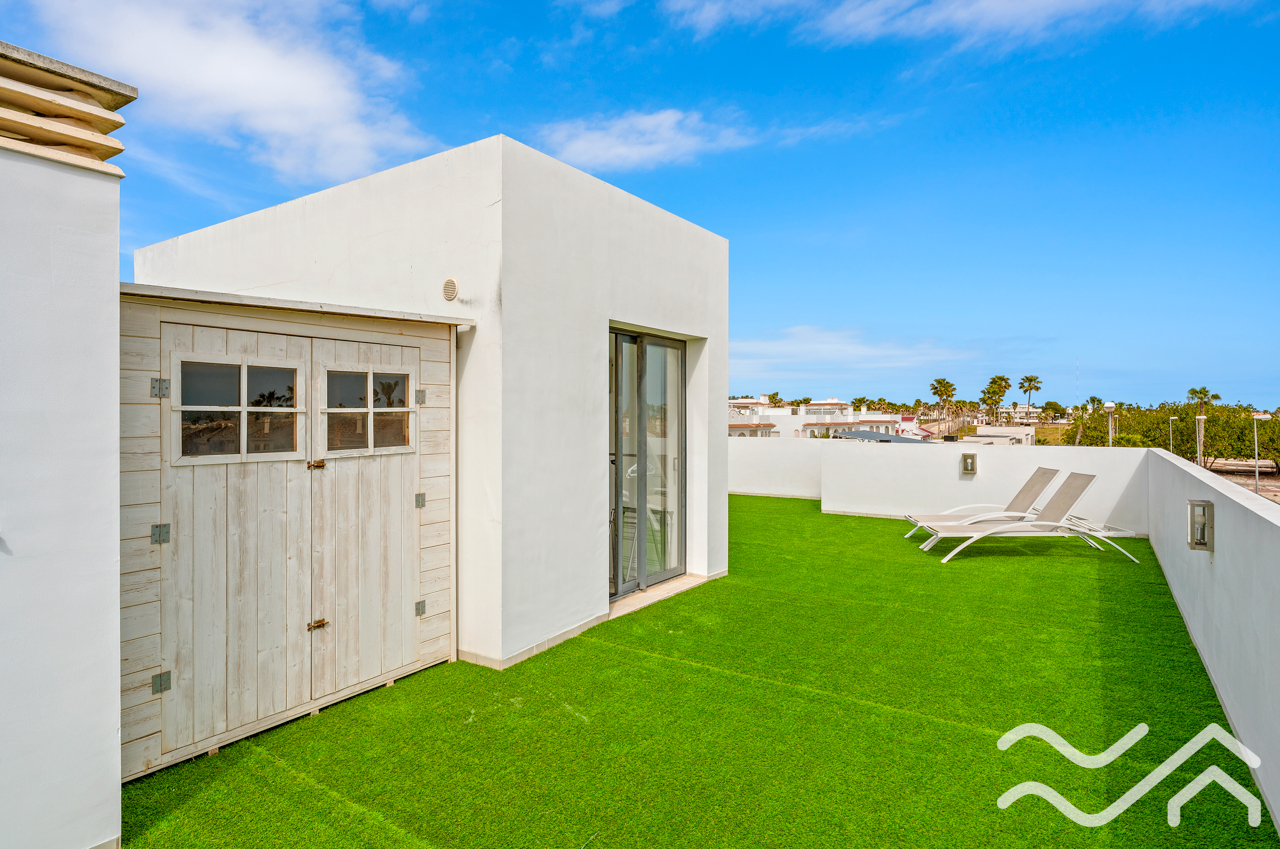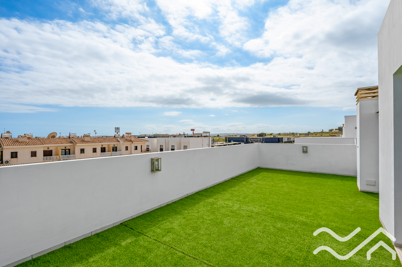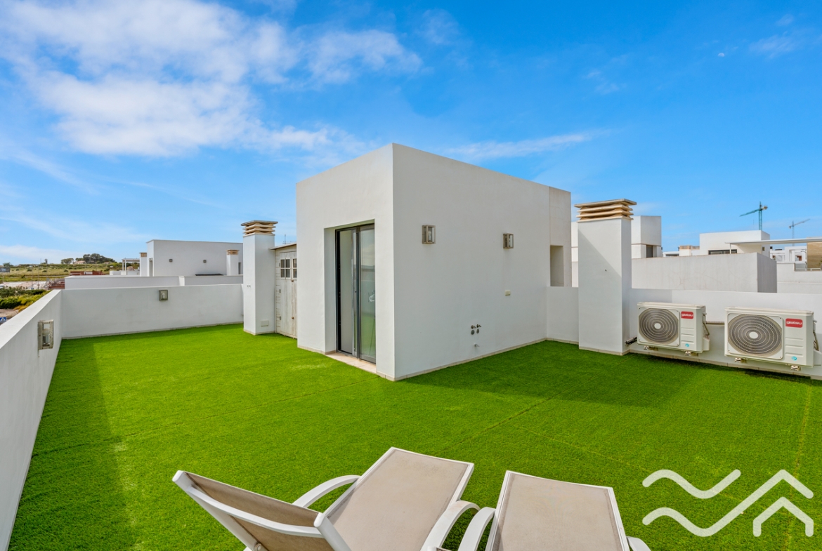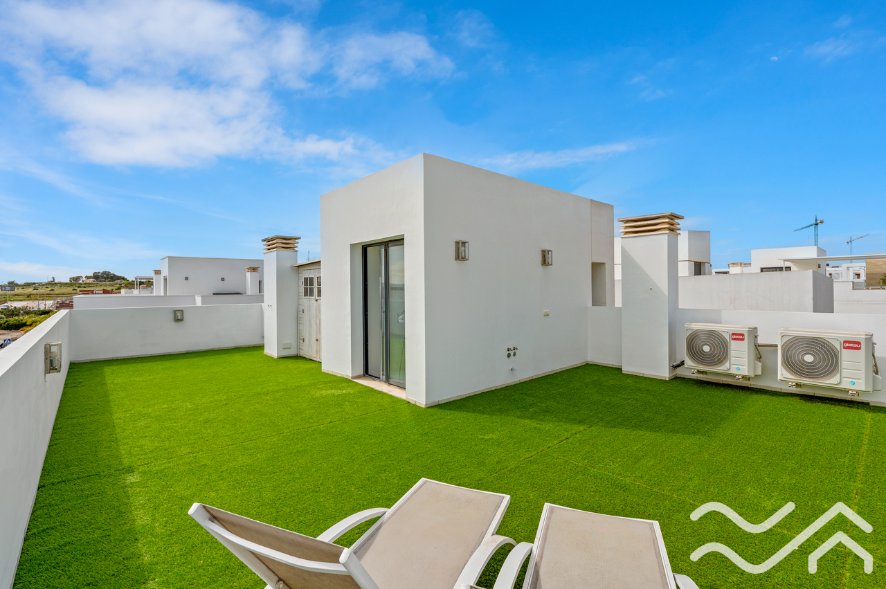 Upstairs, there are three additional bedrooms, all with their own en-suite bathrooms. This creates a comfortable and private setup, whether you have family visiting or simply enjoy having a bit of extra space. From here, you continue up to the rooftop terrace of approximately 60 m² – a real highlight of the home. Up here, you can enjoy sunshine all day long along with open views over the surrounding area and towards the nearby salt lakes. It’s the perfect spot for morning coffee, evening drinks, or just a quiet moment in the sun.