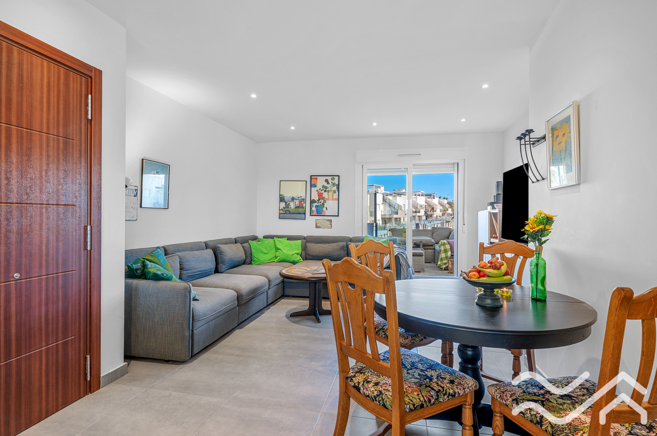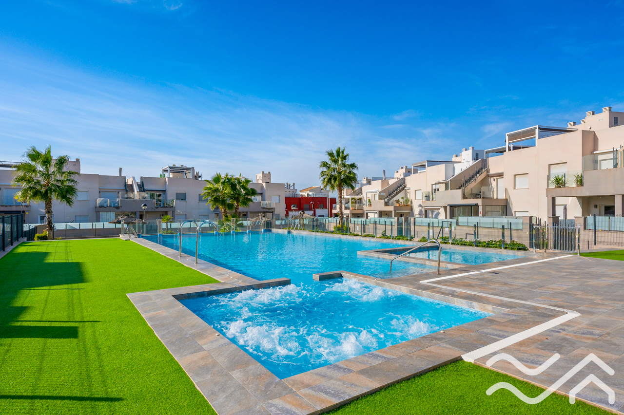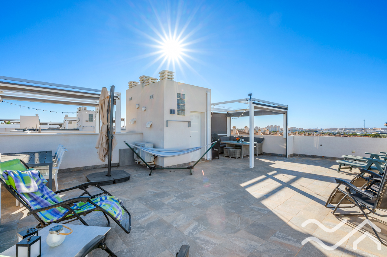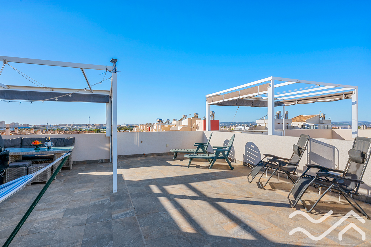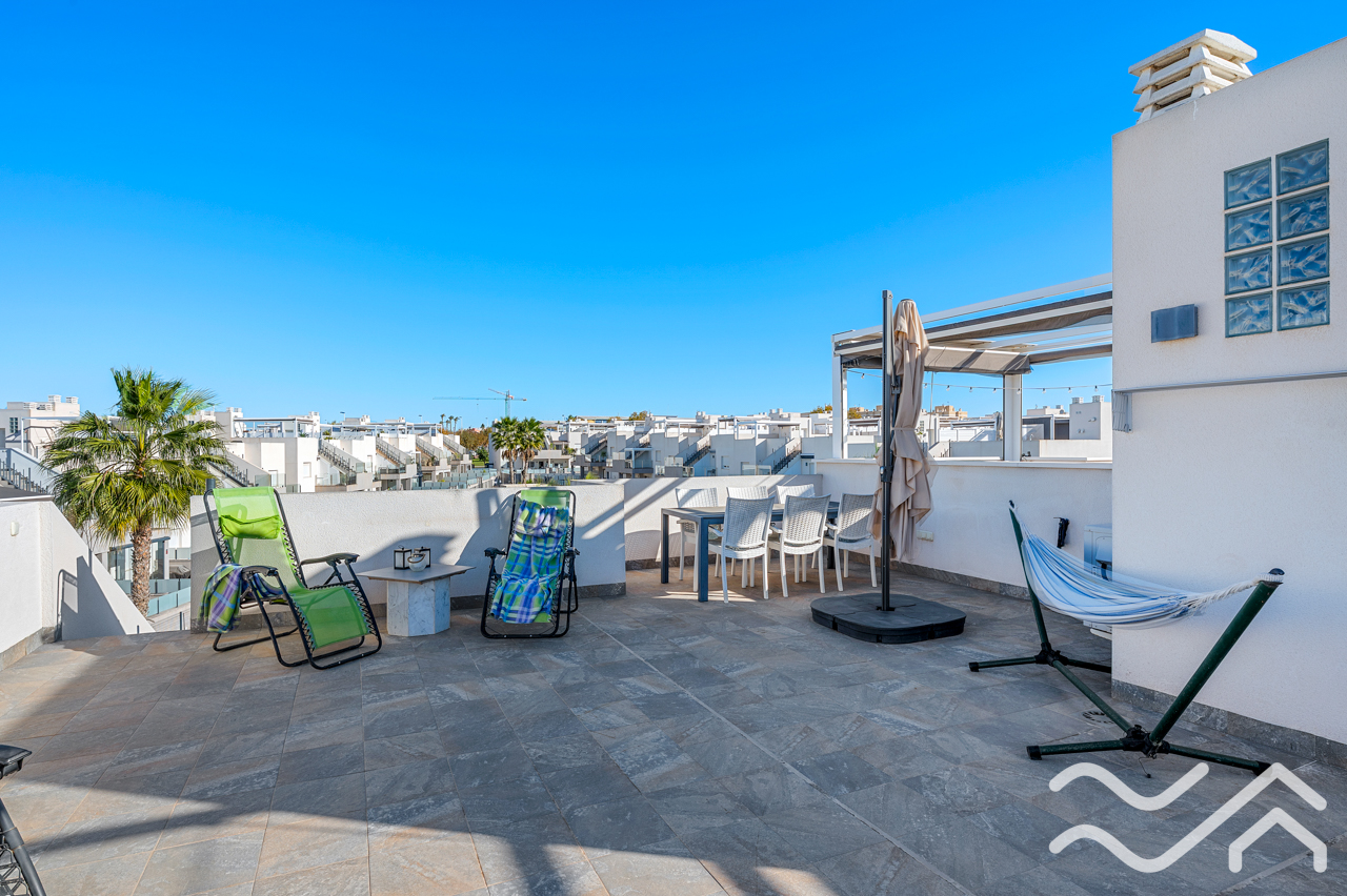 This modern top floor apartment in the popular Aguas Nuevas area offers two bedrooms, two bathrooms, a spacious private roof terrace, lovely communal pool and underground parking – only about 1.5 km from the sea.