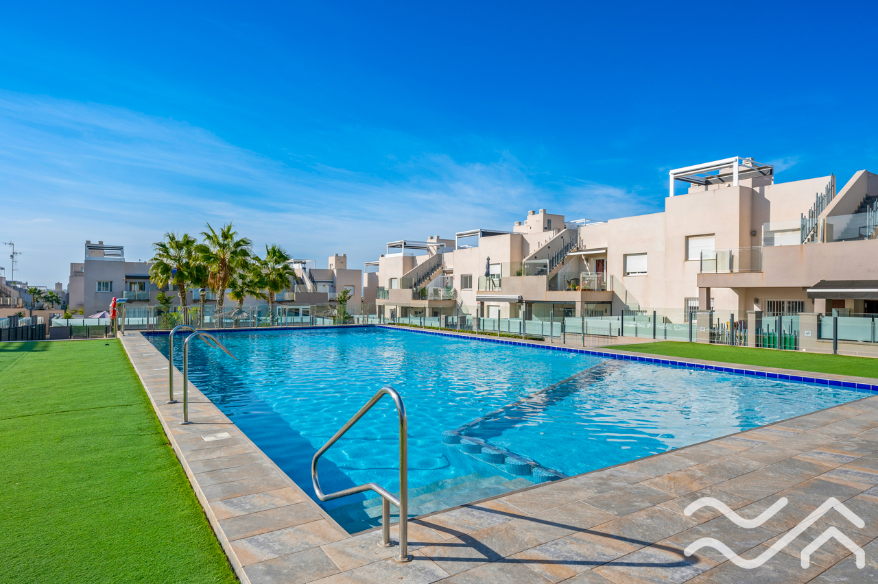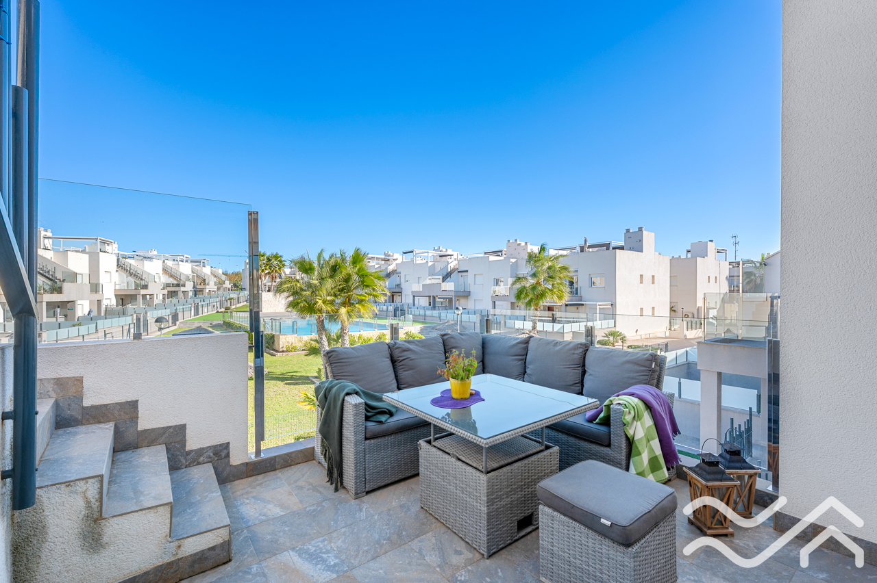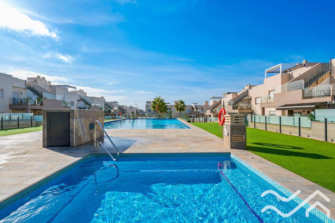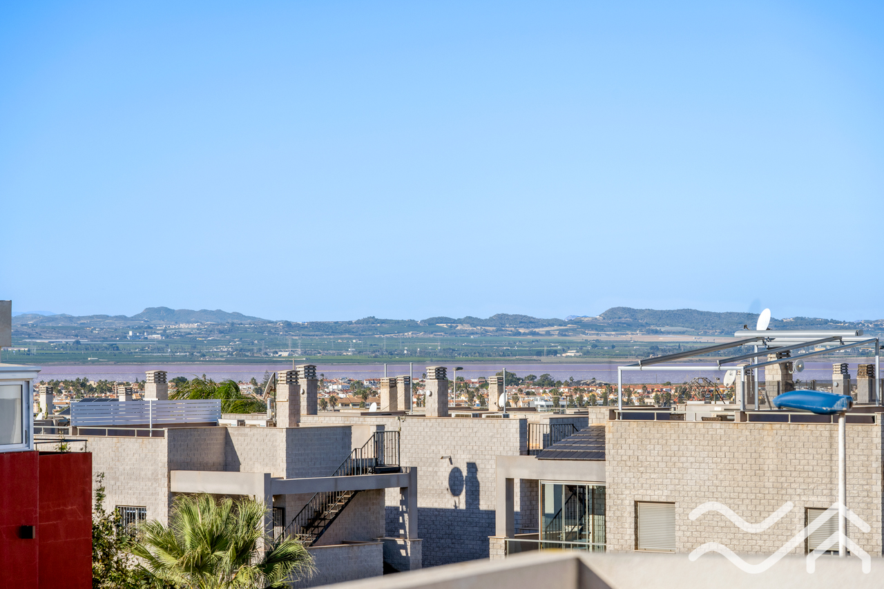 This modern top floor apartment in the popular Aguas Nuevas area offers two bedrooms, two bathrooms, a spacious private roof terrace, lovely communal pool and underground parking – only about 1.5 km from the sea.