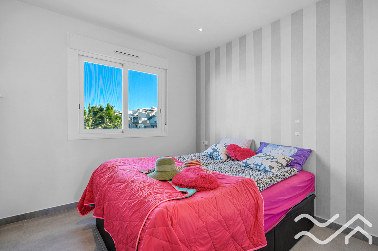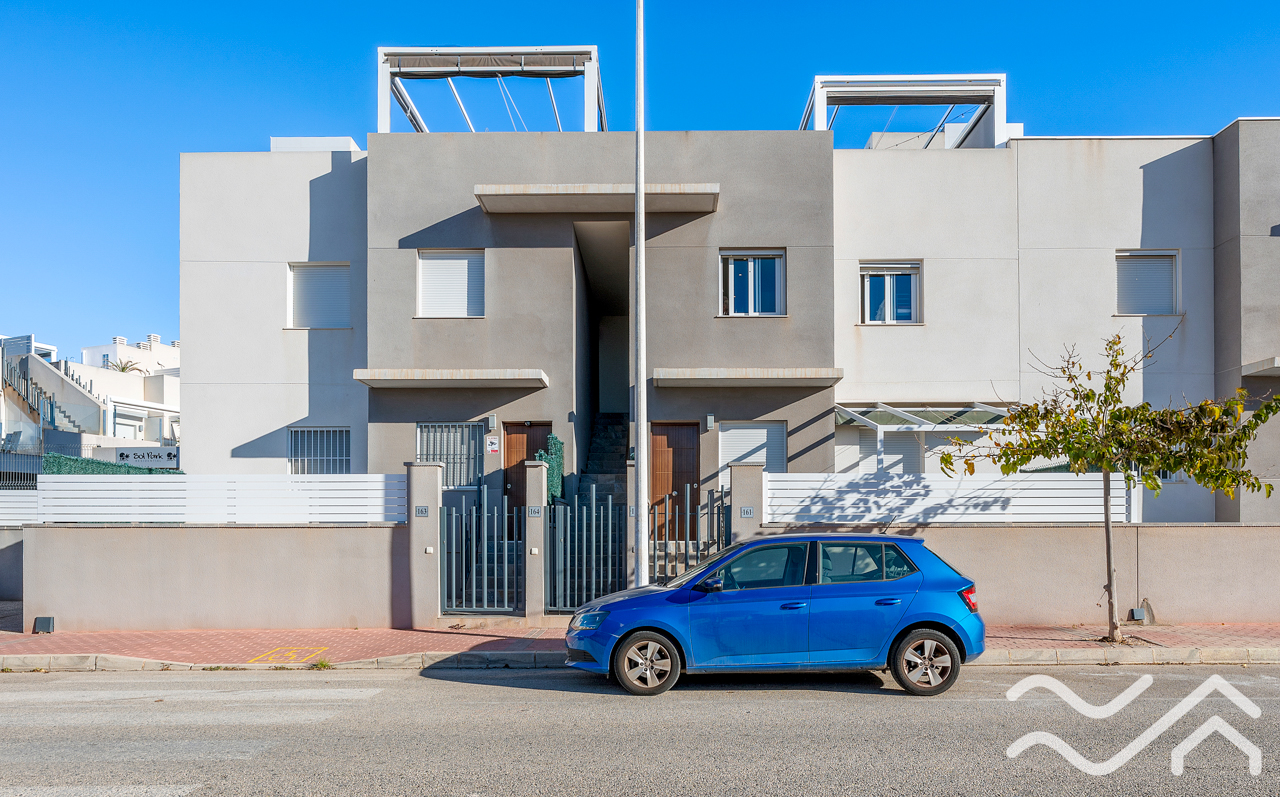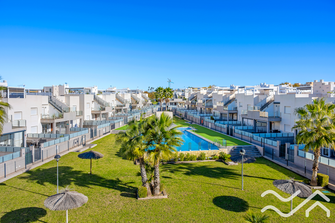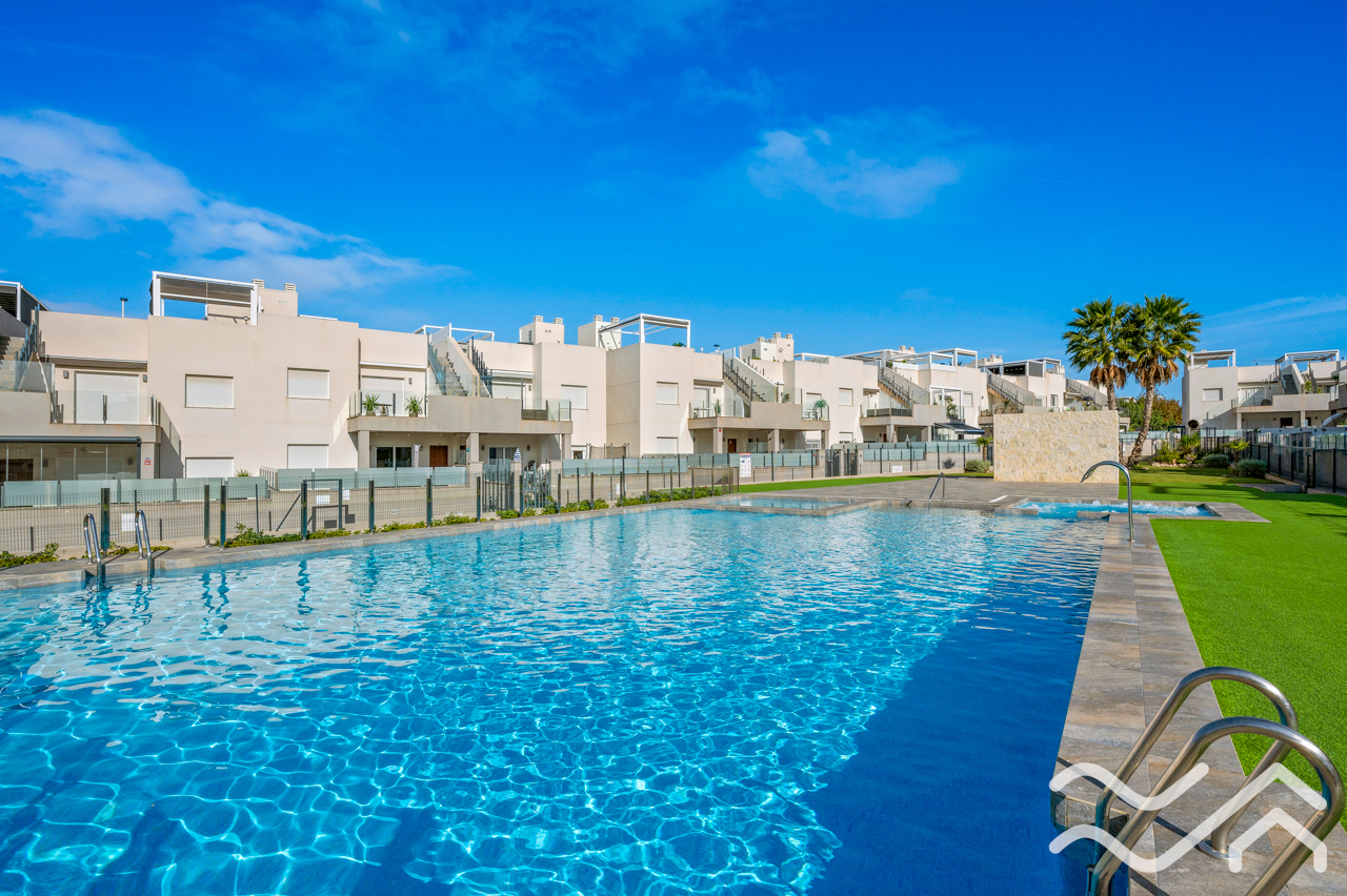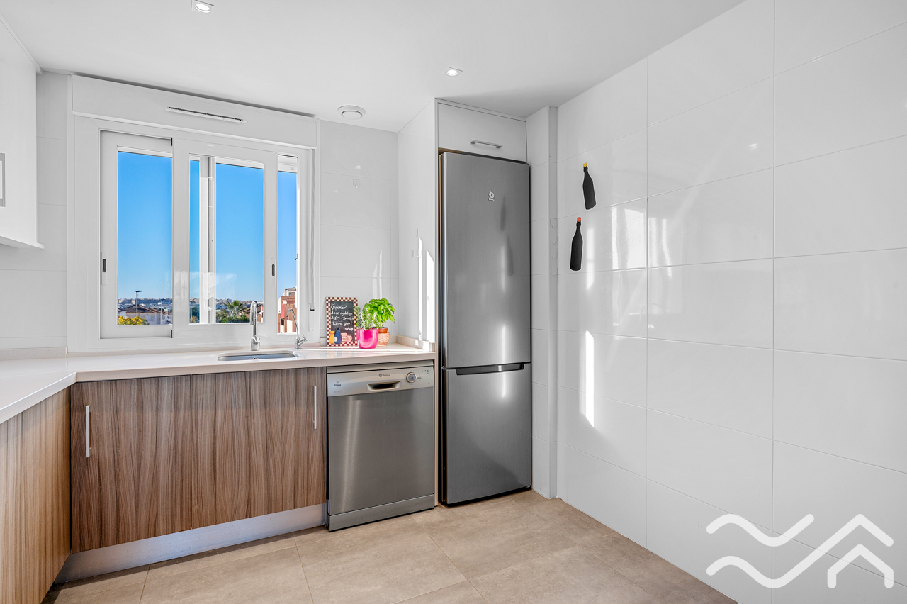 This modern top floor apartment in the popular Aguas Nuevas area offers two bedrooms, two bathrooms, a spacious private roof terrace, lovely communal pool and underground parking – only about 1.5 km from the sea.