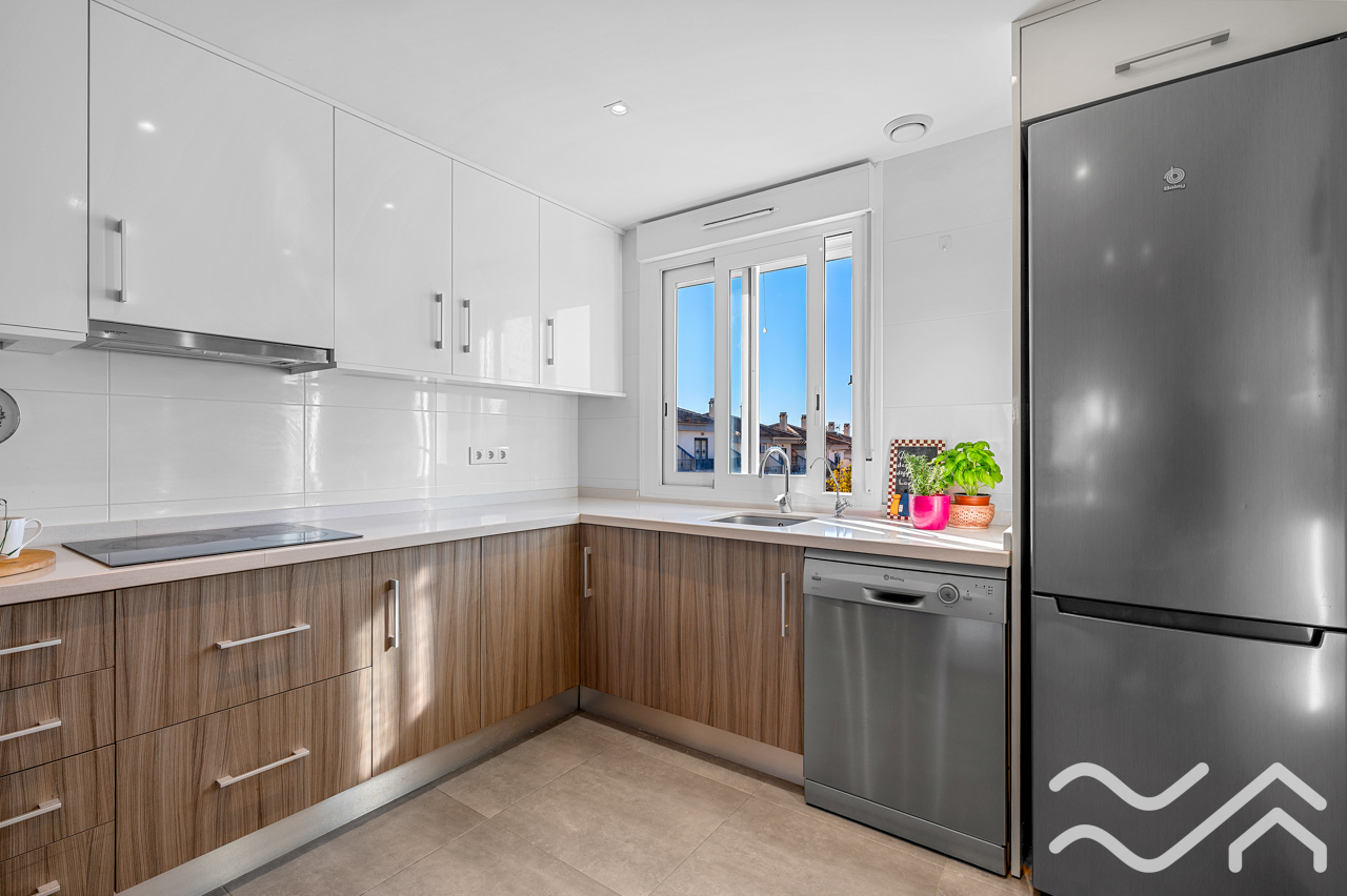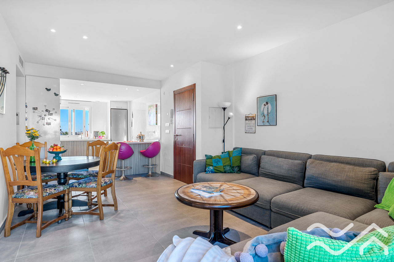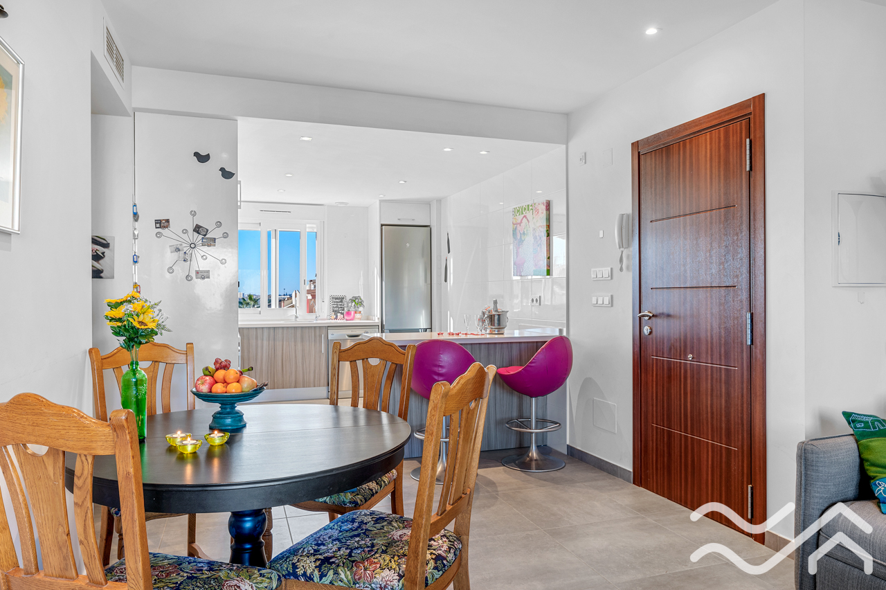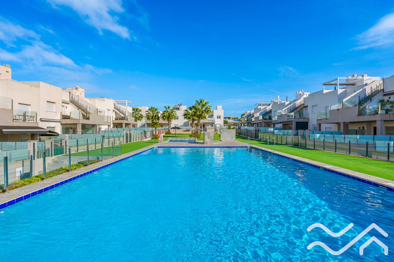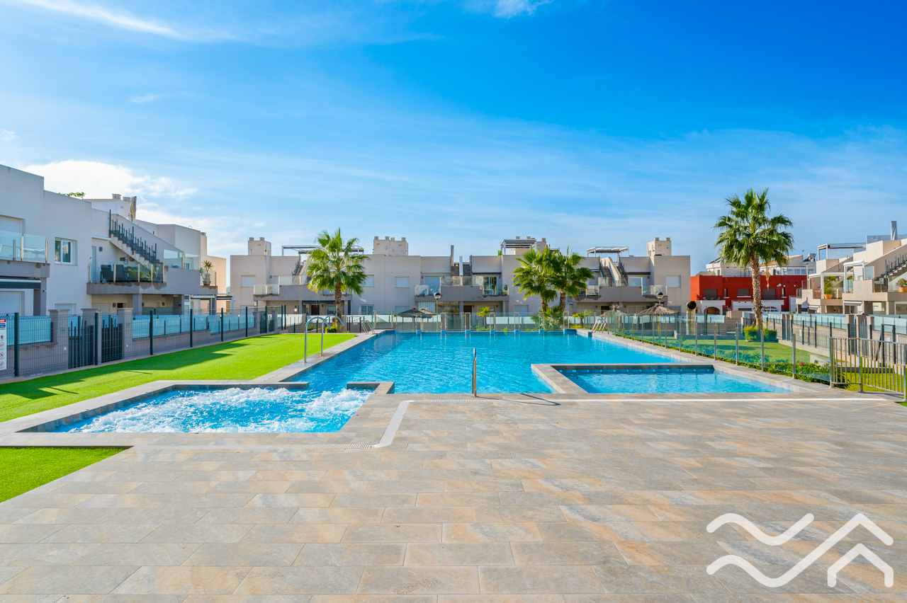 This modern top floor apartment in the popular Aguas Nuevas area offers two bedrooms, two bathrooms, a spacious private roof terrace, lovely communal pool and underground parking – only about 1.5 km from the sea.