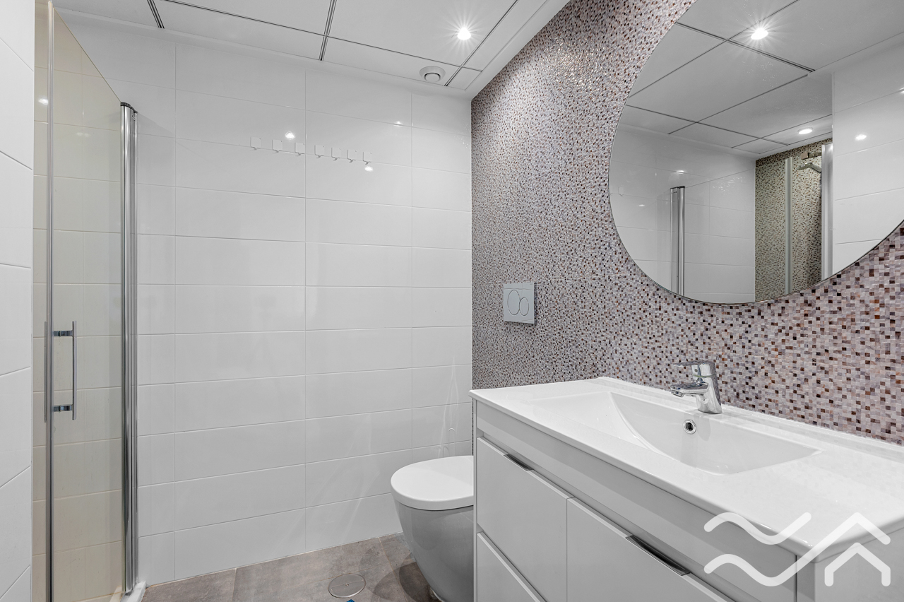 Inside, the layout is practical and comfortable, with an open-plan living and kitchen area, two good bedrooms and two modern bathrooms. The master bedroom has its own en-suite bathroom, and both bedrooms have room for wardrobes. Both bathrooms are tastefully fitted with showers. The apartment is sold furnished and with white goods included, so you can move straight in without needing to think about all the practical details.