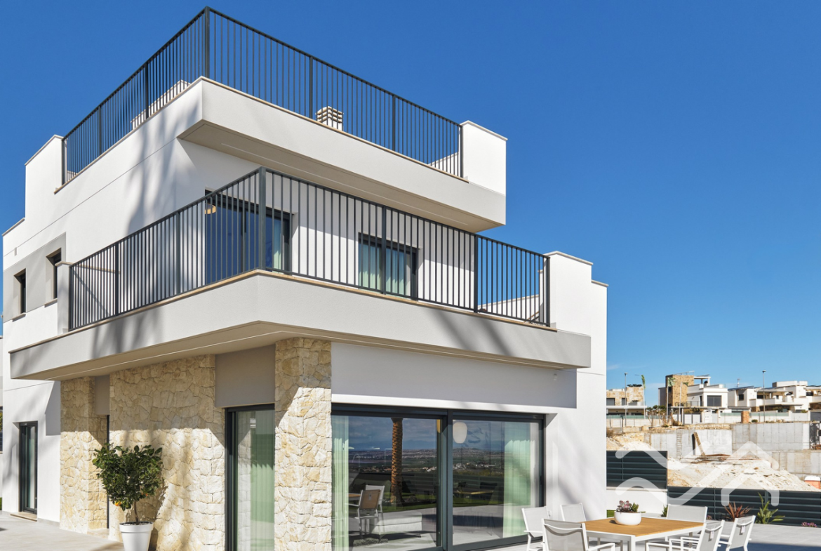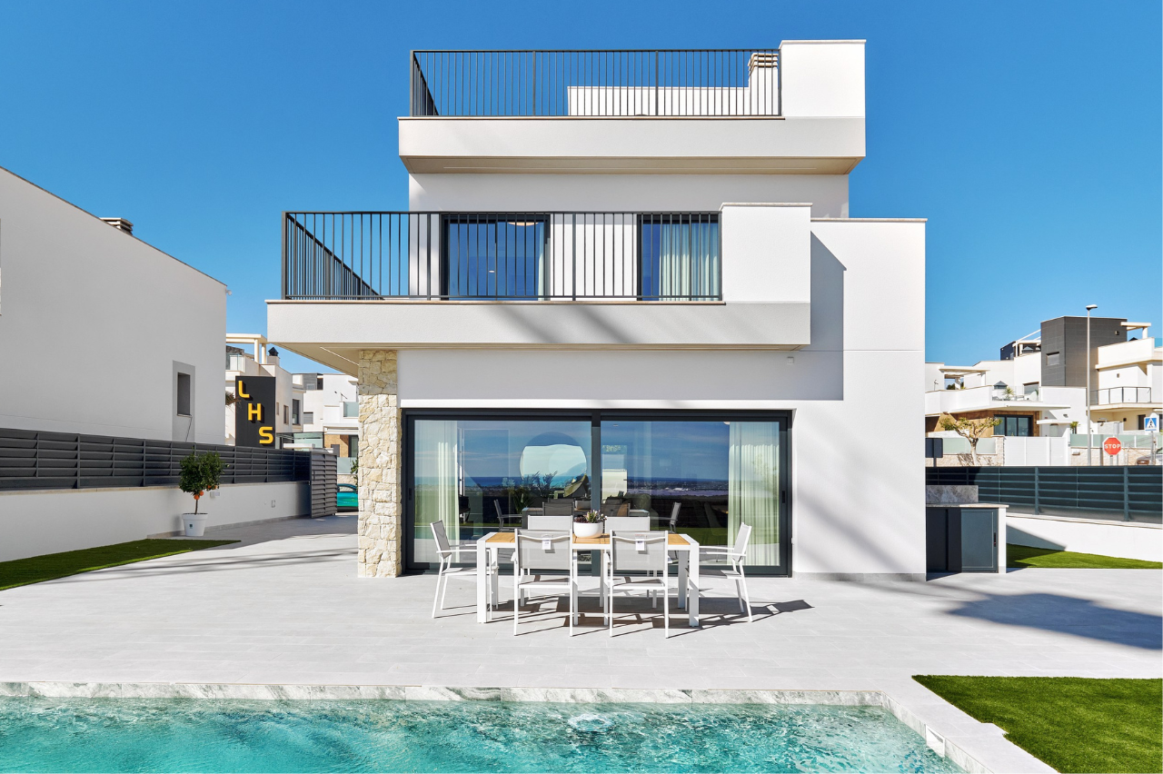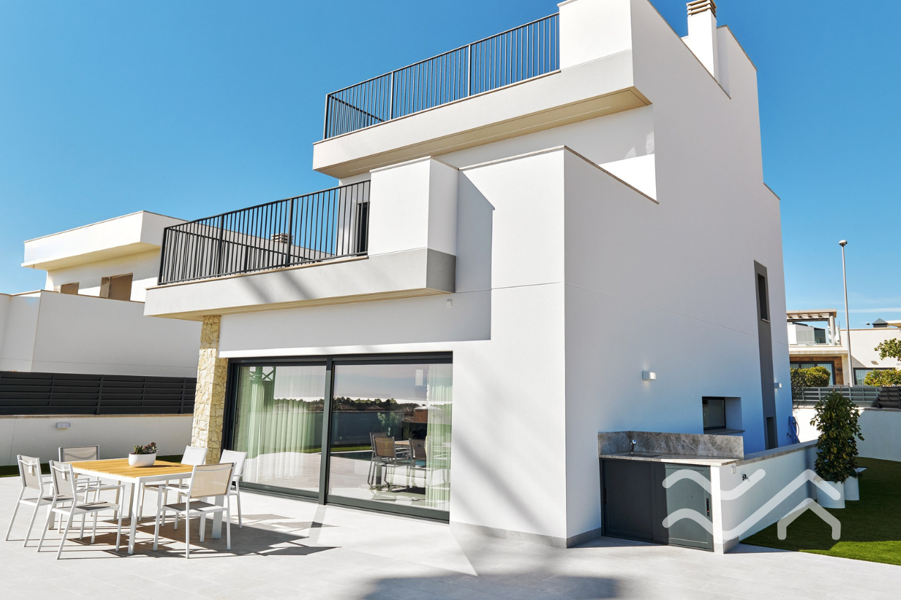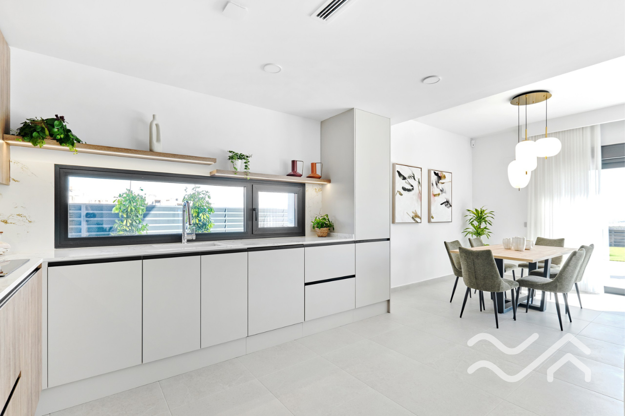 This is an exclusive new development of contemporary villas designed with smart layouts and large windows that allow plenty of natural light to flow through the home. The properties offer three bedrooms and three bathrooms, with an open-plan living room and kitchen that creates a bright and social living space – perfect for both everyday living and entertaining.
