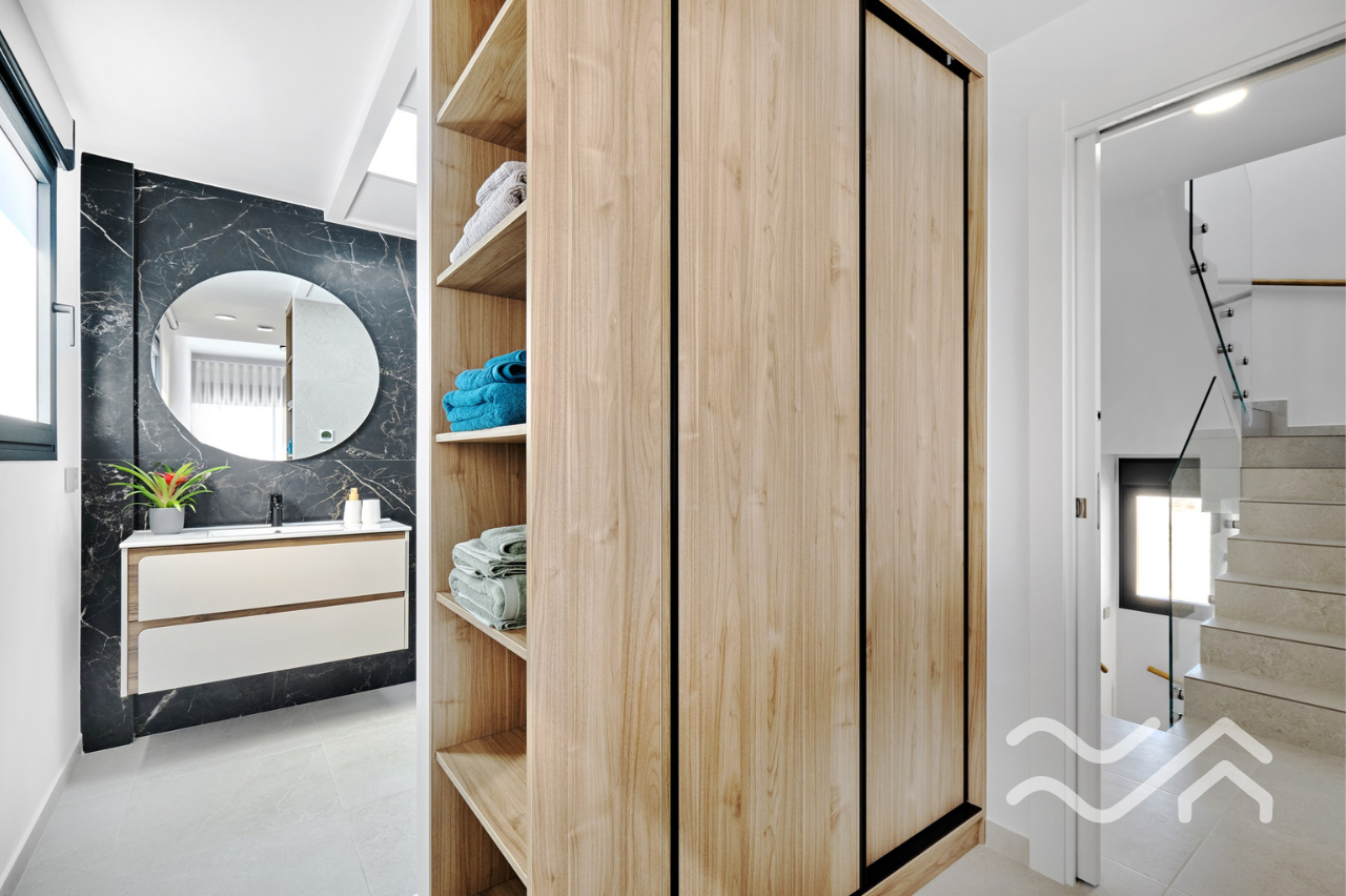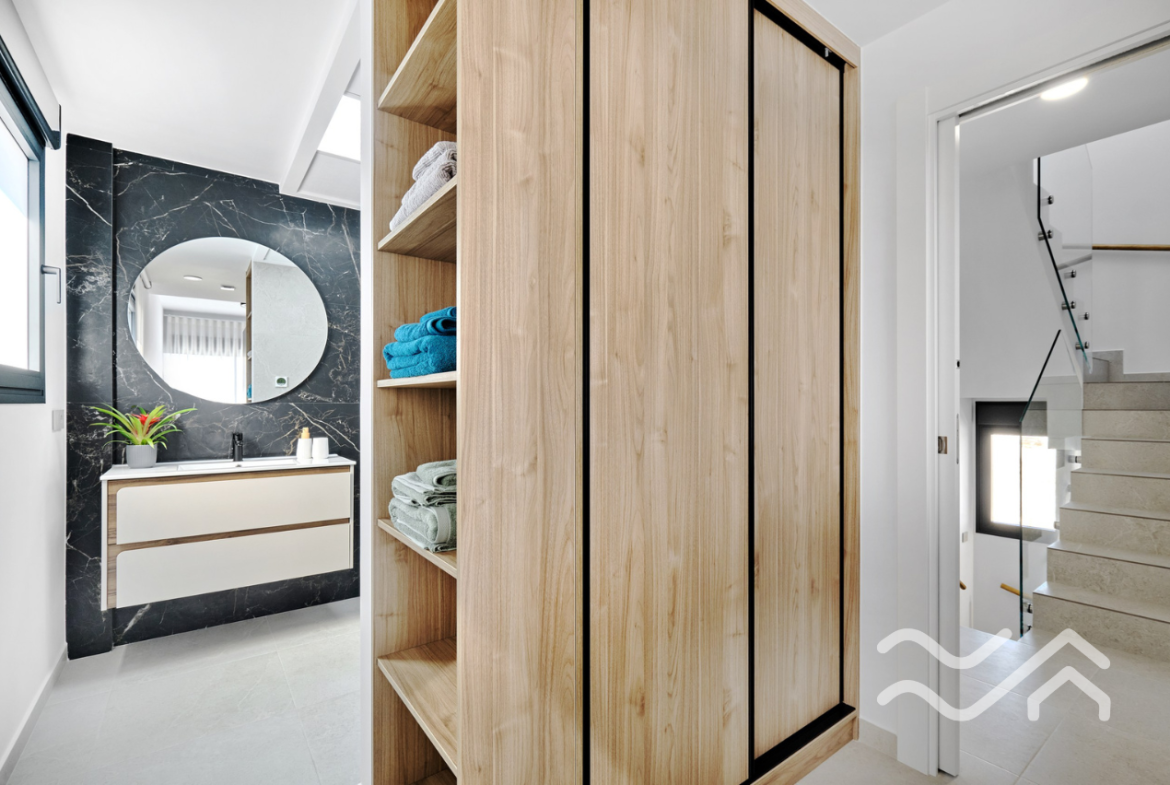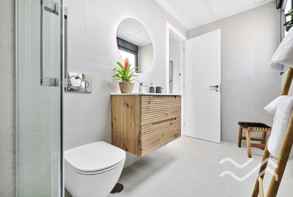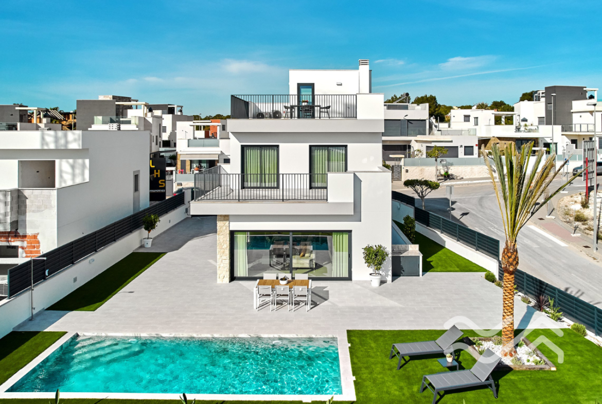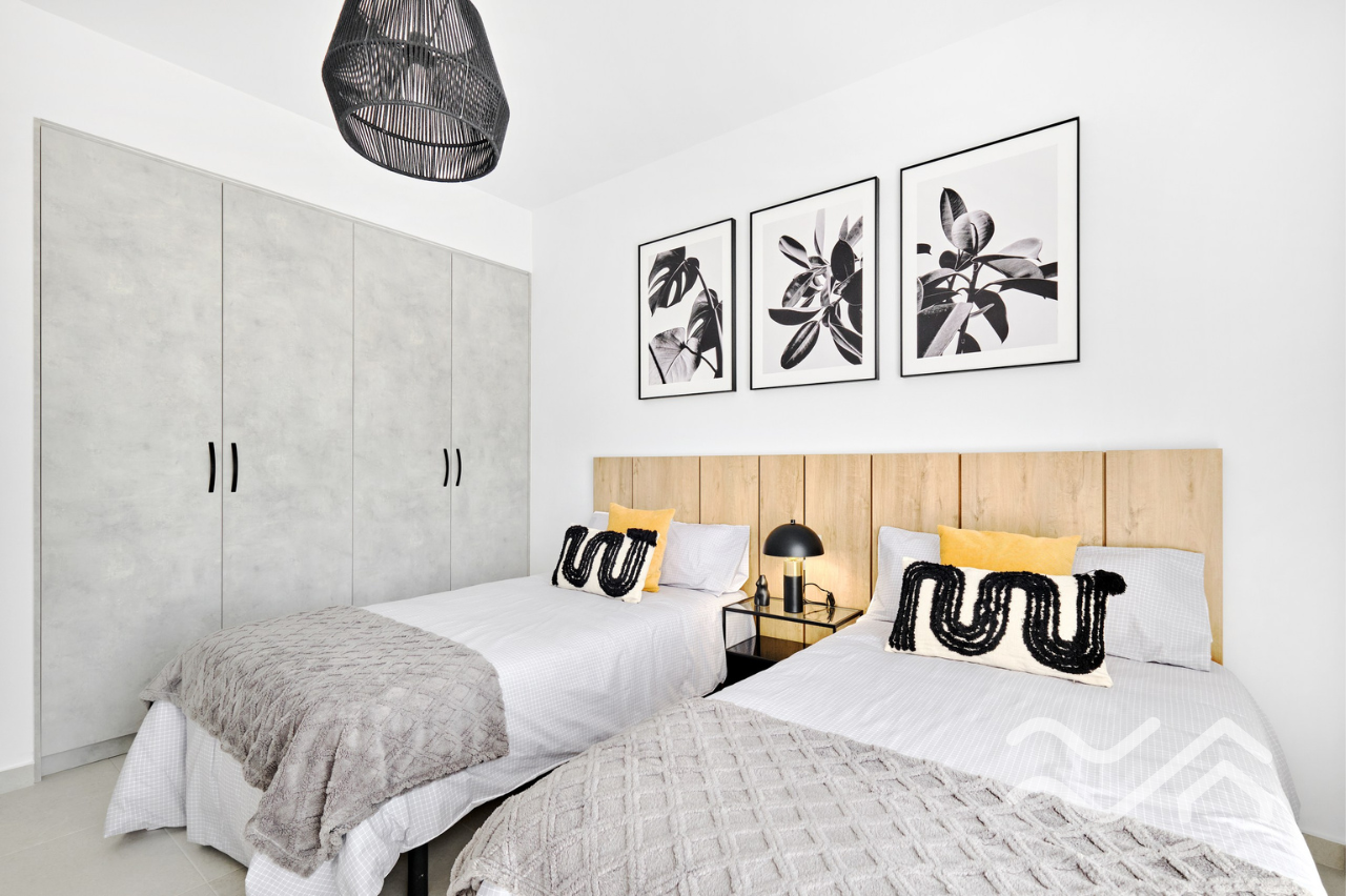 This is an exclusive new development of contemporary villas designed with smart layouts and large windows that allow plenty of natural light to flow through the home. The properties offer three bedrooms and three bathrooms, with an open-plan living room and kitchen that creates a bright and social living space – perfect for both everyday living and entertaining.